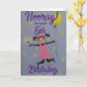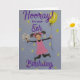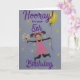 En förtjusande 5-årsdagskort för en flicka, hoppar av glädje, iklädd rosa klänning med blommor och ballong i händerna.