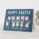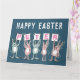 Påskkort för någon med ett namn på 5 bokstäver. Roligt påskkort med illustration av kaniner i rosa och blått. Kaninerna håller upp kort för att stava namnet.