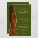 Den moderna bröllopsinbjudan från elegantens lämnat kant har en bränd orange och en rost vattenfärg agate gräns trimmad med faux guld glitter. Anpassadet kombinerar handskrift, rityta och kursivt typsnitt med guld-färgad mot en oliv grönt bakgrund. På baksidan finns blanksteg för 5 foton (3 vågrät 1 kvadrat och 1 lodrät) och plats för webbadressen till bröllop eller annat kortfattat meddelande.