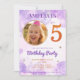 Celebrate special day with this enchanting purple and gold 5th birthday party invitation! Featuring a dreamy watercolor background with sparkling gold glitter accents and whimsical stars, this design is perfect for a magical celebration. Easily personalize with your photo, name, and all your party details for a truly unique invitation that will delight guests and create lasting memories. Make her 5th birthday unforgettable with this beautiful and customizable design.