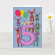 This adorable fifth birthday card is perfect for either a boy or a girl. It features five colorful and patterned donkeys behind a large number 5. On top of the number 5, there are five cupcakes.