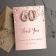Ett tack för en 60-årsdag. En övertoningsbakgrund i ro guld färg. Med ro guld bländande stjärnor. På framsidan: nummer 60 skrivet med ett stil-ballong, ett handskript med stor mörk ro guld och texten: Tack, text, rubrik och datum. Tillbaka: Anpassa och lägg till tackkort och namn.