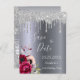 A Spara datumet för en 60:e födelsedagsfest. En mörk faux silver metallic tittar bakgrund. Dekorerad med mörkens lila och blommor från burgundy och ro rosa, faux glitter droppning, färgdropputseende. Mallar för namn och datum. Texten: Spara datumet är skrivet med ett stort, modernt, handskript i stil. Tips! Om du inte vill att det ska se ut som ett vykort klickar du på anpassa, går till baksidan och tar bort delaren och lägger till frimärke.