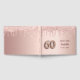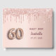En gästbok för en girig och glamorös 60:e födelsedagsfest. Ett faux ro guld-bakgrund med ro guld faux glitter droppar, färgdroppstift. Anpassa och lägg till namn och datum. Namn är skrivet i mörk ro guld med ett modernt handskript i stil. Nummer 60 skrivs med ett stil-teckensnitt med ballong.
