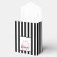 En förmånslåda för en 60:e födelsedagsfest. Klassiskt svart och vitt lodrät rand som bakgrund. Med giftiga och feminina rosa blommor, ro som dekoration. Med texten: Tack! En vit och svart ram på framsidan med mall för ålder, namn och datum. Ålder nummer 60 i rosa, namn och datum i svart. Namn är skrivet med ett handskript i stil.