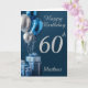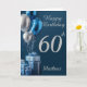 En stilren födelsedags gratulationskort för 60-årsdagen. Kortet har blå och silverfärgade metalliska ballonger och inslagna presenter i blått papper med rosetter, allt på en blå bakgrund och en silverfärgad text, som sedan kan anpassas med namn och personligt meddelande. Meddelandet på insidan lyder för närvarande " Grattis på födelsedagen, Vi önskar dig en rolig och fantastisk 60-årsdag!.