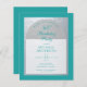 En modern födelsedagsinbjudan. På en tårblå rektangulär bakgrund har den en faux silver-folie som har innesluten tealtext på vit bakgrund. Födelsedagsfesten ord skrivs i ett kalligrafiskt skript för elegant. Den första raden är en pipett.