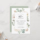 Ät en speciell kvinna med denna elegant 60:e Födelsedagsfest inbjudan. Vit ros som är inkapslat i mjuk grönt eucalyptus löv bildar ett modernt botaniskt ram. Hela texten kan redigeras så att du kan beskriva ditt speciella firande perfekt
