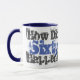 60 år gammal. Hur hände sextio? Är det fet grafiskt meddelande på detta blå och vita mugg?