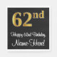 Den här sofistikerade, elegant- och snyggt-födelsedagstecknet papper napkin-designen har ett stort ordnummer "62nd" med faux/imitation guld-liknande gradient mönster, tillsammans med födelsedagstecknet "Lycklig 62nd Birthday" och ett eget namn i ett skript-stil-teckensnitt. Bakgrunden är svart på färgad. Snyggt pappra servetter som denna kan vara roligt till använda vid ett party som hålls för någon som firar sin sextioandra födelsedag. [~Z0000516]
