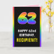 Den här roliga och uppseendeväckande symbolen för födelsedagskalendern har ett stort nummer "62" med ett multifärgat regnbågsspektrum som inspirerar till gradient mönster, tillsammans med meddelandet "LYCKLIG 62:a BIRTHDAY" och en anpassningsbar mottagare av namn. Insidan innehåller ett redigerbart hälsning-födelsedagsmeddelande, eller så kan det kanske rensas och lämnas tomt om ett meddelande ska skrivas för hand i stället. Ett glatt, anpassat födelsedag av det här slaget kan vara ett roligt sätt att skicka lite önskemål till någon som firar sin sextiosekundersfödelsedag. [~Z0000636]