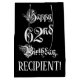 Den här detaljerade och lyxiga presentsäcksdesignen med födelsedagstext innehåller meddelandet "Lycklig 62:a födelsedag" i stil-text med ornitat skript, på en svart färgad. Den har också en anpassningsbar som tar emot namn. En sådan här presentsäck på elegantens födelsedag kan vara ett respektabelt sätt att figurera en gåva eller present som ges till någon som firar sin 62-årsdag. [~Z0000557]