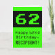 Den här gigantiska och roligt-födelsedagskalans hälsningskort har en stor grönt för datorspel stil nummer "62" på framsidan. Det innehåller också hälsning:s födelsedagsmeddelande "62:a födelsedag i Lycklig" och ett namn som kan vara personlig. Insidan innehåller ett hälsning-meddelande från anpassadets födelsedag, eller kan kanske tas bort och lämnas tomt om ett meddelande ska skrivas för hand i stället. Ett hälsningskort för roligtens födelsedag som detta kan användas för att skicka ett hälsning-födelsedagsmeddelande till heder för 60-årsdagen av en datorhistoriker, en vetenskapsman eller någon som uppskattar datorspel i vintagen. [~Z0000430]