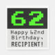 Den pappra napkin-designen för den här stora och neriga födelsedagskalan har ett stort grönt klassiskt datorspel stil nummer "62" på en svart färgads bakgrund. Det innehåller också hälsning:s födelsedagsmeddelande "62:a födelsedag i Lycklig" och ett eget namn. Roligt pappra blöjor av det här slaget kan användas vid en party som hålls i firande på 60-årsdagen av en ingenjör, en vetenskapsman eller någon som uppskattar klassiskt videospel. [~Z0000404]