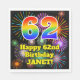 Denna spännande och trevliga pappra napkindesign med födelsedag har ett stort nummer "62" med en färgstark regnbågsspektrumövertoning som inspirerade mönster, tillsammans med meddelandet "Lycklig 62:a födelsedagen" och ett eget namn. Bakgrunden är ett flerfärgat mönster som inspirerats av brinnande fyrverkerier. Den här typen av färgfulla födelsedagskalender kan användas i party för någon som firar sin sextioandra födelsedag. [~Z0000574]