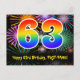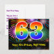 Framsidan av denna färgglada, roliga och spännande födelsedagstema postkortsdesign har en stor siffra "63" med ett regnbågsspektrum-gradering inspirerat mönster, tillsammans med meddelandet "Grattis på 63-årsdagen," och ett anpassat mottagarnamn. Framsidan har dessutom ett livfullt och färgglatt bakgrundsmönster inspirerat av utseendet på sprängande firande fyrverkerier. Baksidan har ett personligt födelsedagsgratulationsmeddelande, eller kanske kan rensas och lämnas tomt om ett meddelande ska skrivas för hand istället. Ett födelsedagskort som detta kan vara ett roligt sätt att skicka födelsedagsönskningar till någon som firar sin sextiotredje födelsedag. Postkort som detta kan också användas för att bj