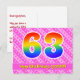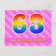 Framsidan på denna glada och trevliga födelsedagskortdesign har en stor siffra "63" med ett mönster inspirerat av regnbågens färgskala. Den har också texten "Grattis på 63-årsdagen" och ett anpassat mottagarnamn. Framsidan har dessutom ett glatt mörkt rosa och ljust rosa randigt mönster med hjärtformer. Baksidan har ett redigerbart födelsedagsmeddelande, eller kan rensas och lämnas tomt om ett meddelande ska skrivas för hand istället. Ett anpassningsbart födelsedagskort som detta kan vara ett roligt sätt att uppmärksamma någon på deras sextiotredje födelsedag. Kort som detta kan också användas för att inbjuda gäster till en födelsedagsfest eller firande som hålls för någon som fyller