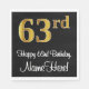 Den här eleganten, sofistikerad och lyxig födelsedagstext med den pappra napkin-designen har ett stort ordnummer "63:e" som har ett utseende som präglas av faux/imitation guld-inspirerad, tillsammans med hälsning-födelsedagstexten "Lycklig 63:e födelsedagen" och ett redigerbart namn i ett skript-stil-teckensnitt. Den har också en bakgrund med svart färgad. Sofistikerad födelsedag med pappra blöjor som detta kan användas vid en födelsedagsfest som firar någons 63-årsdag. [~Z0000516]