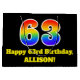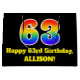 Den här roligten och den färgstarka presentsäcksdesignen har ett stort nummer "63" med en regnbågsspektrumövertoning som inspirerade mönster. Det innehåller också budskapet "63:e födelsedagen i Lycklig" och en personlig namn. Den har också en bakgrund med svart färgad. En presentpåse som denna kan användas när en gåva eller present ge till heder för någons 63-årsdag. [~Z0000521]