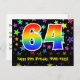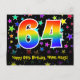 Framsidan av denna roliga, färgglada och spännande födelsedagstemanpassade vykortdesign har en stor siffra "64" med ett regnbågsspektrum-gradering-mönster, tillsammans med meddelandet "Grattis på 64-årsdagen", och ett anpassningsbart mottagarnamn. Framsidan har dessutom ett livfullt och färgglatt stjärnformsmönster i bakgrunden. Baksidan har ett redigerbart födelsedagsmeddelande, eller skulle kunna rensas och lämnas tomt om ett meddelande ska skrivas för hand istället. Ett anpassningsbart födelsedagsvykort som detta kan vara ett roligt sätt att uppmärksamma någon på deras sextiofjärde födelsedag. Vykort som detta kan också användas för att inbjuda gäster till en födelsedagsfest som
