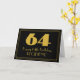 I vintage inspirerade stil och 1920-talet/1930-talet, stil, den matematiska hälsningskortens utformning, ett stort konst deco stil inspirerade nummer "64", meddelandet "Lycklig 64:e födelsedag", ett redigerbart namn och ett gräns mönster som består av tunt linjer på framsidan. Bakgrunden till framsidan är svart färgad. Insidan har ett hälsning-meddelande på anpassningsbarnas födelsedag, eller kan kanske tas bort och lämnas tomt om ett meddelande ska skrivas för hand i stället. Ett sådant här hälsningskort för personligens födelsedag kan användas för att bekräfta någons sextiofjärde födelsedag. [~Z0000498]