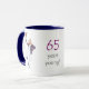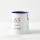 Den här vita ringaren mugg, med mörk blått läppar och handtag, gör en underbar födelsedagspresent för 65 år gammal! Bilden, baksidan och framsidan är av en "äldre man" som dansar, i en blazer- och boathatt, från en vattenfärgsillustration av Judy Adamson. Mellan de två manarna finns texten - 65 år unga!