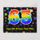 Den främre delen av denna färgglada, roliga och spännande födelsedagstematiska postkortdesign har en stor siffra "65" med ett regnbågsspektrum-gradering-mönster, tillsammans med meddelandet "Grattis på 65-årsdagen," och ett redigerbart mottagarnamn. Framsidan har dessutom ett färgglatt och livfullt mönster av stjärnformer. Baksidan har ett anpassningsbart födelsedagsmeddelande, eller kanske töms och lämnas tomt om ett meddelande ska skrivas för hand istället. Ett anpassningsbart födelsedagskort som detta kan vara ett roligt sätt att fira någon på deras sextiofemårsdag. Postkort som detta kan också användas för att inbjuda gäster till en födelsedagsfest som hålls för någon som fyller 65 år.