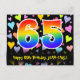 Framsidan av denna spännande, färgglada och kärleksfulla födelsedagskortdesign har en stor siffra "65" med ett regnbågsspektrum-gradering-inspirerat mönster. Den har också texten "Grattis på 65-årsdagen," och ett redigerbart mottagarnamn. Framsidan har dessutom ett livfullt och färgglatt mönster av kärleksfulla hjärtan. Baksidan har ett anpassat födelsedagsmeddelande, eller kan eventuellt rensas och lämnas tomt om ett meddelande ska skrivas för hand istället. Ett födelsedagskort som detta kan vara ett roligt sätt att skicka födelsedagsönskningar till någon som firar sin sextiofemte födelsedag. Postkort som detta kan också användas för att inbjuda gäster till en födels