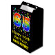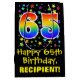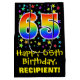 Denna pulserande, färgstarka och spännande presentsäcksdesign med födelsedagstext har ett stort nummer "65" med en regnbågsspektrumgradient stil mönster, tillsammans med meddelandet "Lycklig 65e Birthday", och en anpassade mottagare namn. Den har också en bakgrund i mönster med stjärnformer av olika storlek och färg. En presentpåse som denna kan användas när man slår in gåvor som ges till någon i firande på deras sextiofemårsdag. [~Z0000510]