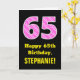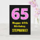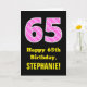 Den här glatta och roligt-födelsedagskalan med hälsningskortet har ett stort nummer "65" som har en rosa i mörken och ljusa rosa, randiga mönster som innehåller hjärtformer på framsidan. På framsidan finns också hälsning-födelsedagsmeddelandet "Lycklig 65e Birthday" och anpassadets mottagare namn. Insidan innehåller ett hälsning-meddelande från anpassadets födelsedag, eller kan kanske tas bort och lämnas tomt om ett meddelande ska skrivas för hand i stället. Ett födelsedagskort som detta kan vara ett sätt att skicka födelsedagspresent önskemål till någon som firar sin sextiofemte födelsedag på i roligt. Det kan också vara ett val av roligt för någon vars födelsedag infaller den fjortonde feberdagen (Alla hjärtans dag) på grund av dess kärleksfulla hjärtsymboler och färg. [~Z0000434]