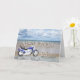 En blå motorcykel som står på en strand med flytande moln i himlar. Grattis på födelsedagen skrivet i sten och speglat i vatten ljugande på sand.