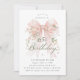 A large blush pink coquette bow is decorated with elegant pink roses on this birthday invitation. Classic script calligraphy lets your guests know it's a milestone birthday. Easy to personalize with your party details.