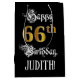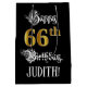Den här utformandet och eleganten av presentsäcksdesignen innehåller budskapet "66:e födelsedagen i Lycklig", plus en personlig som tar emot namn. En del av budskapet finns i en lyxig text med skript-stil. Det stora antalet "66:e" har ett faux/imitation guld-inspirerat utseende mönster. Bakgrunden är svart på färgad. En presentpåse som denna kan användas när en gåva eller present ge till heder för någons 66-årsdag. [~Z0000560]