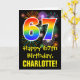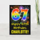 Framsidan av denna roliga, färgglada och spännande födelsedagstema kortdesign har en stor siffra "67" med ett regnbågsspektrum-gradering inspirerat mönster, tillsammans med meddelandet "Grattis på 67-årsdagen," och ett redigerbart mottagarnamn. Framsidan har dessutom ett färgglatt bakgrundsmönster inspirerat av det explosionsliknande utseendet hos firande fyrverkerier. Insidan har ett anpassat födelsedagsmeddelande, eller kan kanske tömmas och lämnas tomt om ett meddelande ska skrivas för hand istället. Ett anpassningsbart födelsedagskort som detta kan vara ett roligt sätt att uppmärksamma någon på deras sextio-sjunde födelsedag.