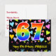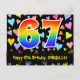 Framsidan av denna färgglada, roliga och kärleksfulla födelsedagskortdesign har en stor siffra "67" med ett regnbågsspektrum-gradering inspirerat mönster, tillsammans med meddelandet "Grattis på 67-årsdagen," och ett anpassningsbart mottagarnamn. Framsidan har dessutom ett färgrikt och livfullt bakgrundsmönster med kärleksfulla hjärtan i olika storlekar. Baksidan har ett anpassningsbart födelsedagsmeddelande, eller kan kanske rensas och lämnas tomt om ett meddelande ska skrivas för hand istället. Ett anpassningsbart födelsedagskort som detta kan vara ett roligt sätt att skicka ett meddelande för att fira någon som fyller sextiosju år. Vykort som detta kan också användas för att inbjuda gäster till en f