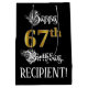 Den här utformandet och eleganten av presentsäcksdesignen innehåller budskapet "67:e födelsedagen i Lycklig" och en anpassningsbar mottagare av namn. En del av budskapet finns i en lyxig text med skript-stil. Det stora antalet "67:e" har ett faux/imitation guld-inspirerat utseende mönster. Bakgrunden är svart på färgad. En opulent gåspåse som denna kan användas när man slår in presenter som ges till någon i firande på deras 67-årsdag. [~Z0000560]