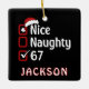 Bring a bit of social media-inspired humor to your holiday décor with this double-sided “Nice, Naughty, 67” ornament. Featuring the same cheeky design on both sides — bold red checkboxes, a Santa hat, and that mysteriously funny “67” — it’s a conversation starter for any tree. The crisp white lettering pops against the classic black background for a sleek, modern look that fits both minimalist and playful Christmas styles. Makes a hilarious stocking stuffer or small gift for friends, coworkers, or anyone who loves random internet jokes. Personalize with any name for an extra touch of fun.