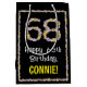 Den här blommigten, den trädgårdsindikerade presentsäcksdesignen för födelsedagspressar, innehåller budskapet "68:e födelsedagen i Lycklig" och en personlig mottagare av namn. Det stora talet "68" och gräns har blomsikoner. En dylik presentpåse på födelsedagen kan vara ett roligt sätt att figurera en present eller gåva som ges för att fira någons sextioåttonde födelsedag. [~Z0000653]
