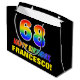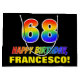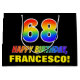 Den här färgstarka, roligt- och munkfärdiga presentväskan har ett stort nummer "68" och meddelandet "GRATTIS PÅ FÖDELSEDAGEN,", båda färgader med en regnbågsspektrumövertoning inspirerade mönster, tillsammans med en fetstilt gult redigerbar mottagare namn. Bakgrunden är svart på färgad. En roligt presentsäck av det här slaget kan användas när man slår in presenter som ges till någon i firande på deras 68-årsdag. [~Z0000477]