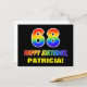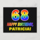 Framsidan av detta roliga, roligt- och färgstarka vykort för födelsedagskalender har ett stort nummer "68" och meddelandet "GRATTIS PÅ FÖDELSEDAGEN", båda färgader med en regnbågsspektrumövertoning inspirerade mönster, tillsammans med en fet gult anpassade mottagare namn. På framsidan finns också en enkel bakgrund för svart färgad. Baksidan av vykortet innehåller ett hälsning-meddelande från anpassningsbarnas födelsedag, eller så kan det kanske rensas och lämnas tomt om ett meddelande ska skrivas för hand i stället. Ett spännande vykort för anpassadets födelsedag som detta kan vara ett roligt sätt att fira någons sextioåttonde födelsedag. [~Z0000474]