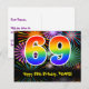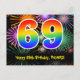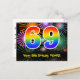 Framsidan av denna roliga, färgglada och spännande födelsedagstema postkortsdesign har en stor siffra "69" med ett regnbågsspektrum gradientinspirerat mönster. Den har också meddelandet "Grattis på 69-årsdagen," och ett anpassat mottagarnamn. Framsidan har dessutom ett livfullt och färgglatt bakgrundsmönster inspirerat av utseendet på sprängande firande fyrverkerier. Baksidan har ett anpassat födelsedagsgratulationsmeddelande, eller kanske kan rensas och lämnas tomt om ett meddelande ska skrivas för hand istället. Ett personligt födelsedagskort som detta kan vara ett roligt sätt att skicka ett meddelande för att fira någon som fyller 69 år. Postkort som detta kan också användas för att bjuda in gä