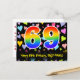 Framsidan av denna spännande, kärleksfulla och färgglada födelsedagstemanpassade postkort visar en stor siffra "69" med ett regnbågsspektrum-gradering-mönster, tillsammans med meddelandet "Grattis på 69-årsdagen," och ett redigerbart mottagarnamn. Framsidan har dessutom ett färgglatt och livfullt kärleksfullt hjärtmönster i bakgrunden. Baksidan har ett anpassat födelsedagsmeddelande, eller kanske kan tömmas och lämnas tomt om ett meddelande ska skrivas för hand istället. Ett födelsedagskort som detta kan vara ett roligt sätt att skicka födelsedagsönskningar till någon som firar sin sextio-nionde födelsedag. Postkort som detta kan också användas för att inbjuda gäster till en