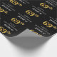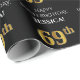 Den lyxiga och elegant födelsedagskalemat som omsluter den pappra designen innehåller meddelandet "LYCKLIG 69:e BIRTHDAY,", ett redigerbart namn, och födelsedagsnumret "69:e", som har ett utseende som inspirerar till faux/imitation guld. Bakgrunden är svart på färgad. Papper som denna kan användas när presenter/presenter som ges i firande på någons 69-årsdag slås in. [~Z0000454]