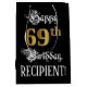 Den här utformandet och finare-födelsedagskalans presentsäcksdesign innehåller budskapet "69:e födelsedagen, Lycklig" och en personlig mottagare namn. En del av meddelandet finns i eleganten script-stil. Det stora antalet "69:e" har ett faux/imitation guld-inspirerat utseende mönster. Bakgrunden är svart på färgad. En matad presentsäck på födelsedagen kan vara ett respektabelt sätt att slå en gåva eller present som ges för att fira någons 69-årsdag. [~Z0000560]