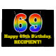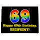 Den här roligten och den robusta presentväskan med födelsedagstext har ett stort nummer "69" med en regnbågsspektrumövertoning som inspirerade mönster, tillsammans med meddelandet "Lycklig 69:e födelsedag" och personlig namn. Bakgrunden är svart på färgad. En färgfull födelsedag med den här presentsäcken kan vara ett sätt att på roligten slå ihop en gåva eller gåva som ges till någon som firar sin 69-årsdag. [~Z0000521]