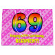 Den här roligten och uppgången på 69:e födelsedag med presentsäcksdesign har ett stort nummer "69" med ett regnbågsspektrum som inspirerar övertoningen mönster. Det innehåller också budskapet "69:e födelsedagen i Lycklig", följt av ett redigerbart namn. Bakgrunden har en rosa i mörk och ett mönster i ljusa rosa rand som innehåller levande hjärtformer i rosa. Sådana presentsäckar kan användas när man slår in presenter eller presenter för att fira någons sextionionde födelsedag. [~Z0000414]