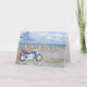 En blå motorcykel som står på en strand med flytande moln i himlar. Grattis på födelsedagen skrivet i sten och speglat i vatten ljugande på sand.