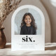 En enkel inbjudan till 6e födelsedag med ett eget foto i bågform och orden "sex" under. Du kan snabbt och enkelt lägga till ett eget foto i den här designen.