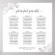 Det här placeringsdiagrammet för 6 bord är både enkelt och elegant med mörkgrå text på en vit bakgrund och luftig silverfalsk folieblommig filigran i hörnen. Titeln lyder "vänligen hitta ditt bord" i en elegant kalligrafisk skrift. Sofistikerat och chic. Inkluderar platstilldelningar för 60 gäster med 10 platser per bord.