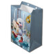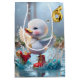 En glad vit anka med röda stövlar i stänk med en puddle med en guld #6-ballong.
